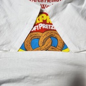 日本でもお馴染みのアメリカの有名なお菓子メーカーJ&J Snack Foods Corp.の代表的なブランド「SUPERPRETZEL」のロゴがデザインされたTシャツ。